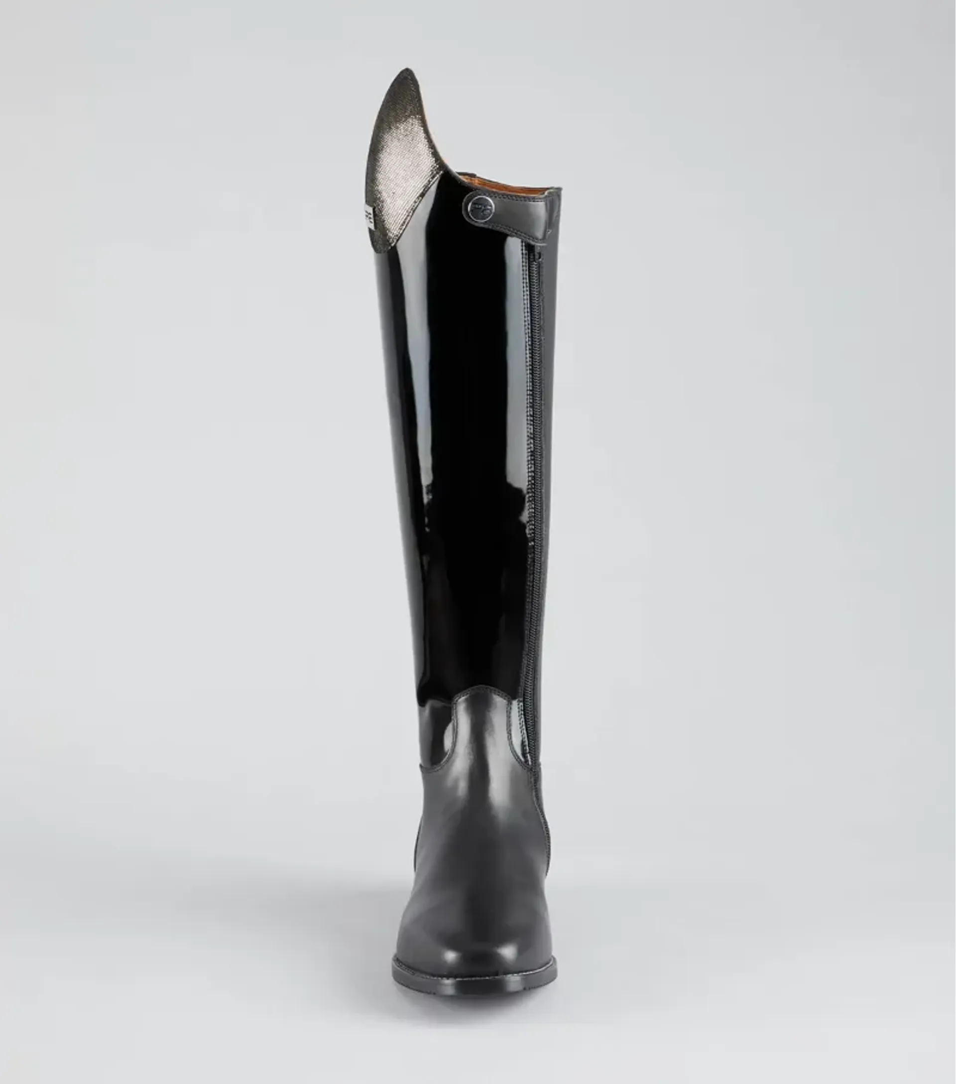 The traditional knee-high length is embellished with patent leather around the outer calf and a metallic detailing at the knee. Offering a sophisticated appearance during everyday leisure riding, training, or competition use.