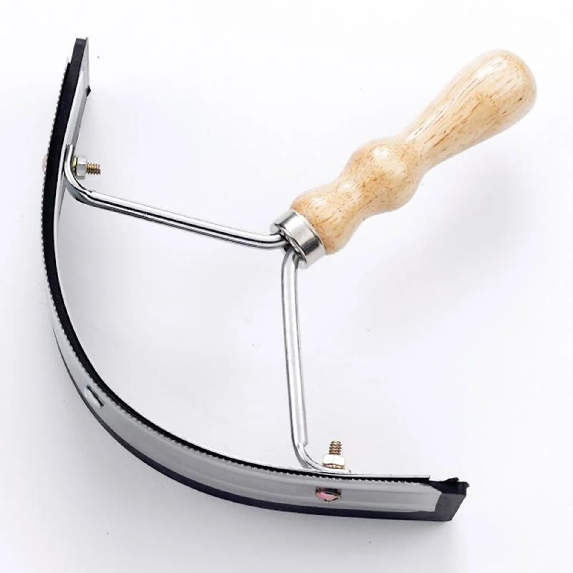 Metal kite frame with wooden handle and rubber edge to remove excess water from the horse's coat.