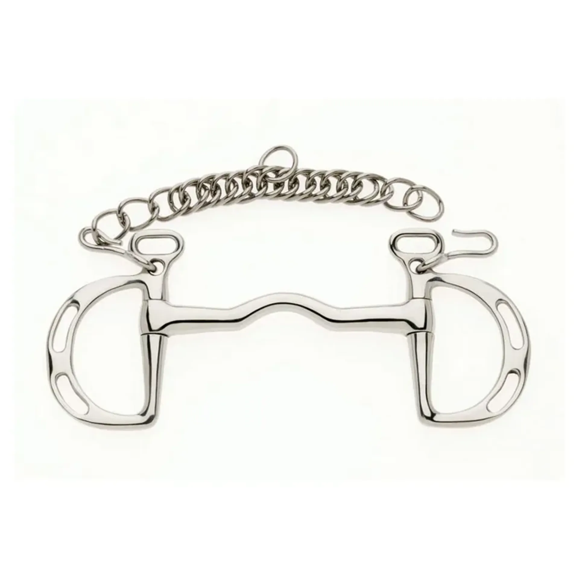 The port mouth mouthpiece of the Kimblewick helps to alleviate tongue pressure, whilst the slotted bit ring can be used to change the action of the curb chain and the amount of poll pressure applied.