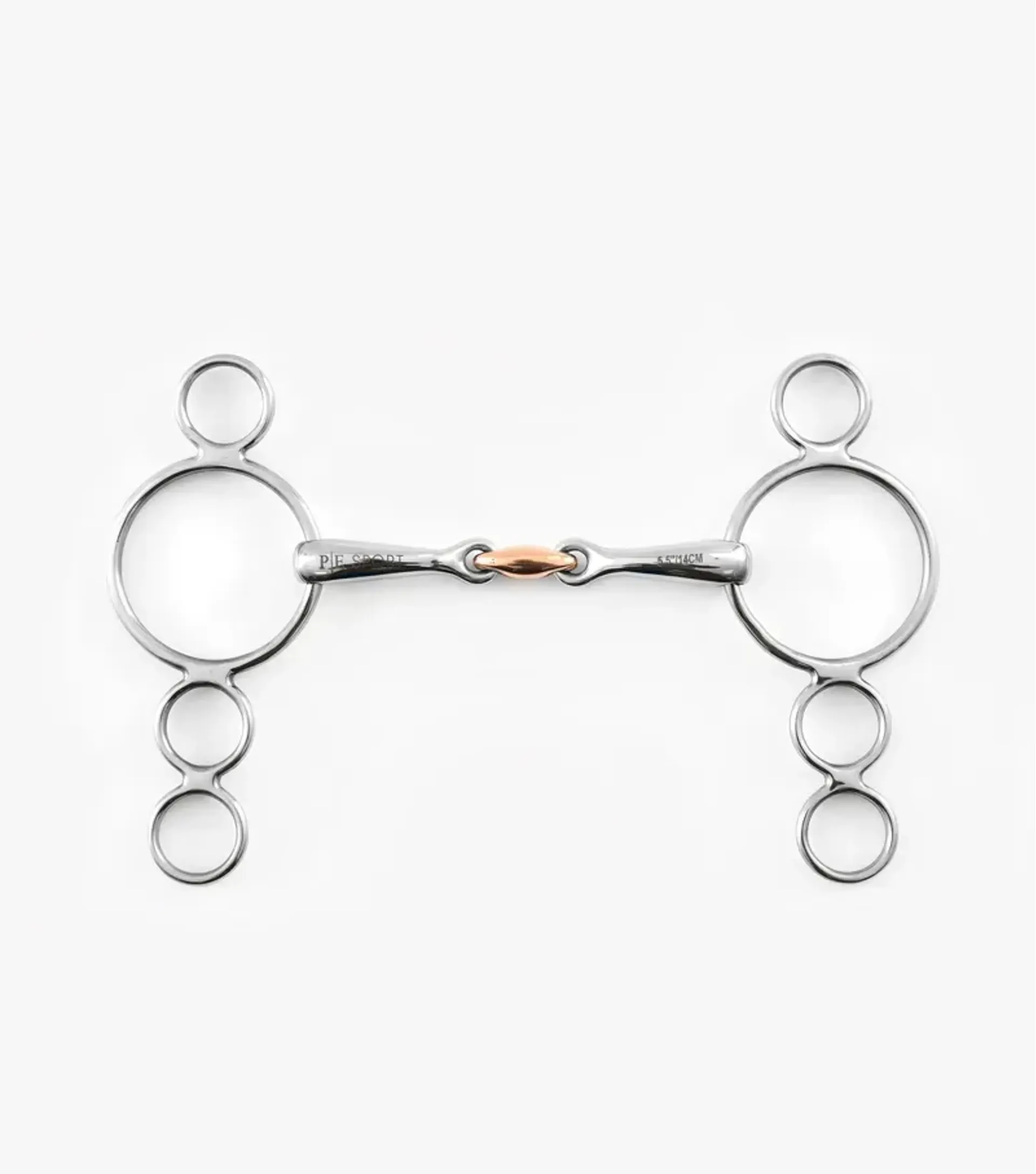 The top ring attaches to the cheek pieces of the bridle and you can attach the reins to any of the three lower rings to provide a variety of different leverage options. Also known as a continental bit, it works by raising the bit in the horse's mouth in a similar way to a traditional gag but without the same severity. Using the reins on the lower rings significantly increases poll pressure which is why Premier Equine recommend using two reins or rounding's attached to a single rein when using them. This ensures that a correct contact can be maintained on the snaffle ring without poll pressure when needed.