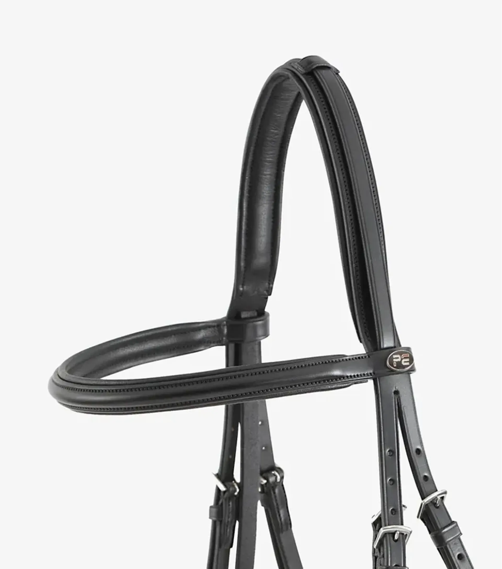 A beautifully soft, padded browband with a round raised design sits neatly at the front, emphasised either side by two luxury Premier Equine branded brooches.