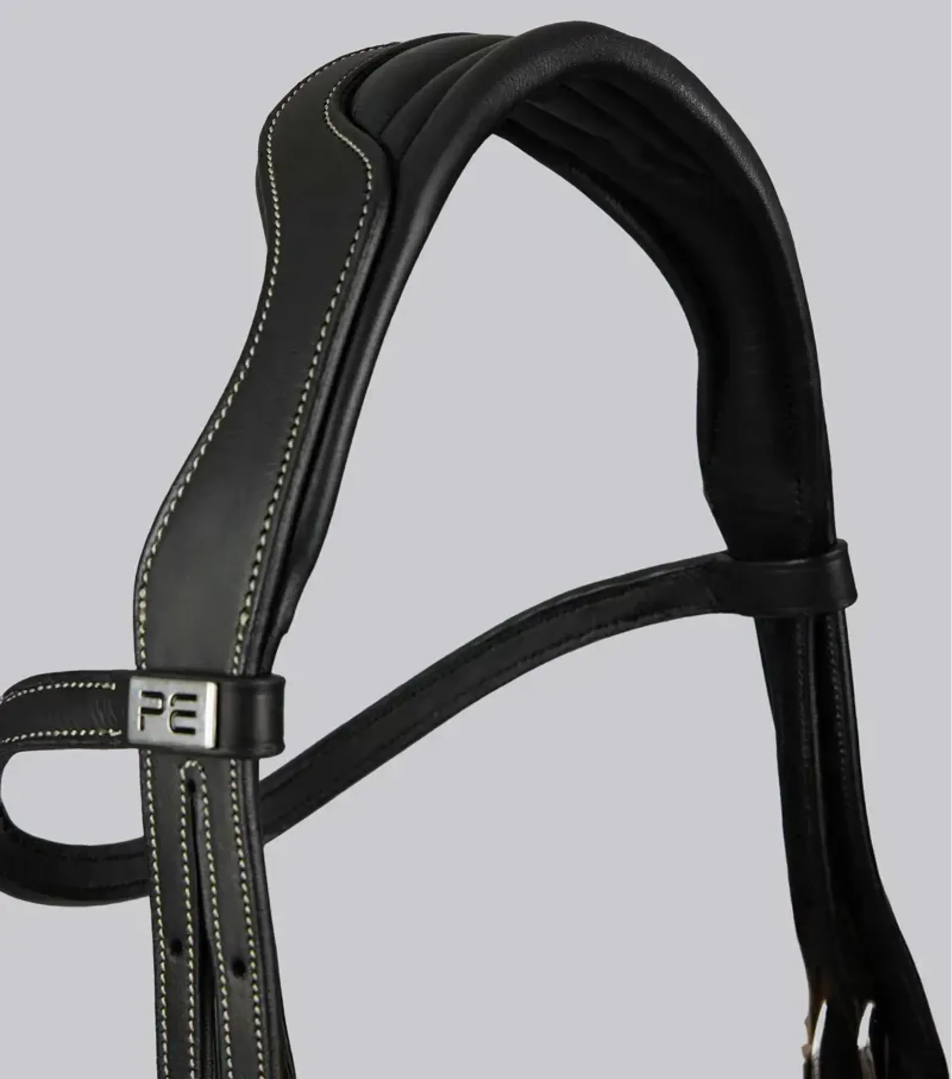 Adorned with a distinguished chrome PE badge on the browband, the Veneto anatomical bridle exudes sophistication and luxury. This subtle yet striking detail enhances the overall aesthetic appeal, making it an attractive choice for riders who appreciate fine attention to detail. The chrome PE badge serves a symbol of quality and craftsmanship, reflecting the meticulous design and construction of the bridle.