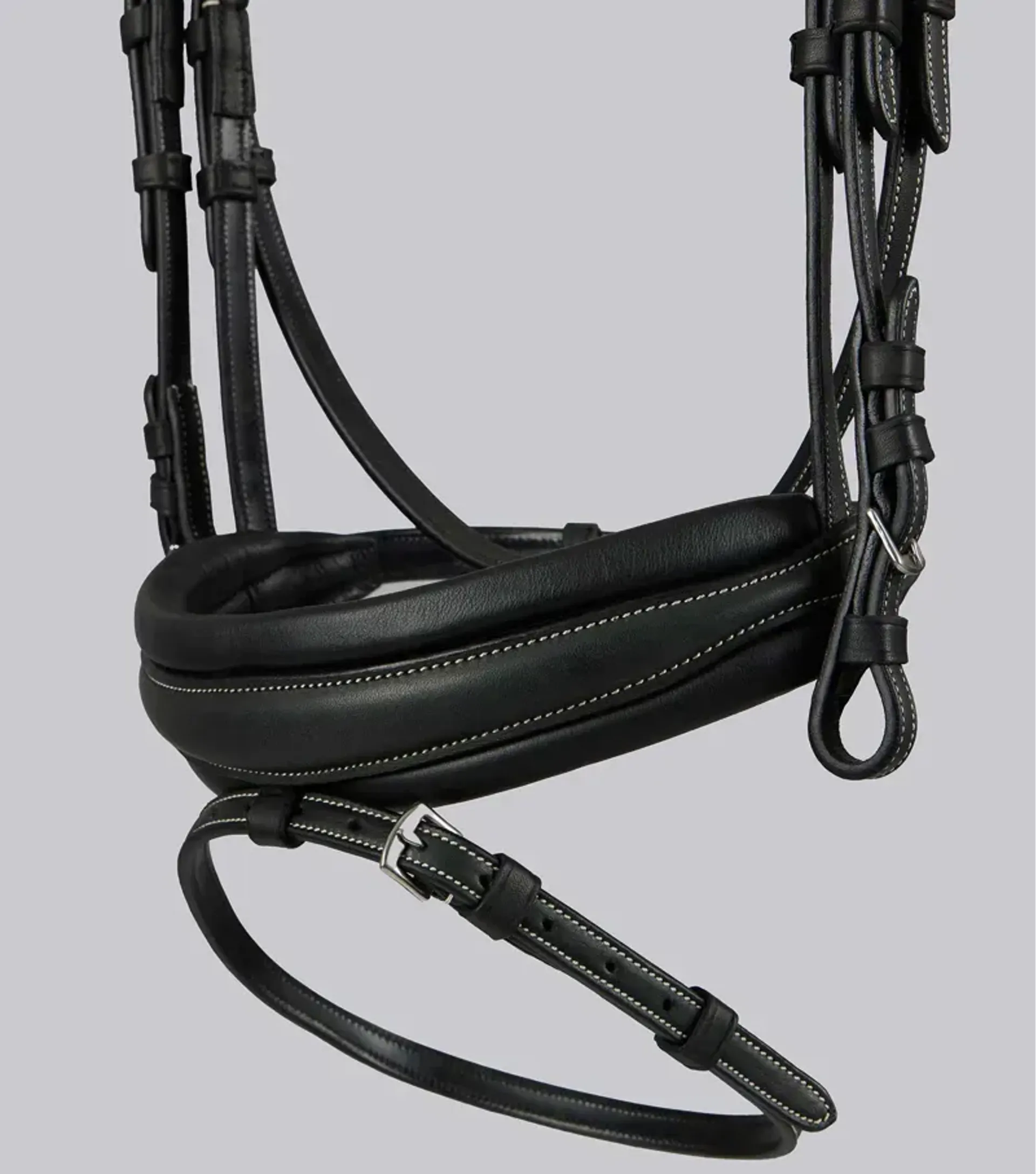 The Veneto snaffle bridle features a stylish contrast stitching across the entirety of the structure, creating a sophisticated and eye-catching look. The contrast stitching adds a touch of elegance to the bridle, making it stand out in the show ring or during everyday riding. The meticulously executed stitching not only enhances the bridles aesthetic appeal but also adds to its overall durability and quality craftsmanship.