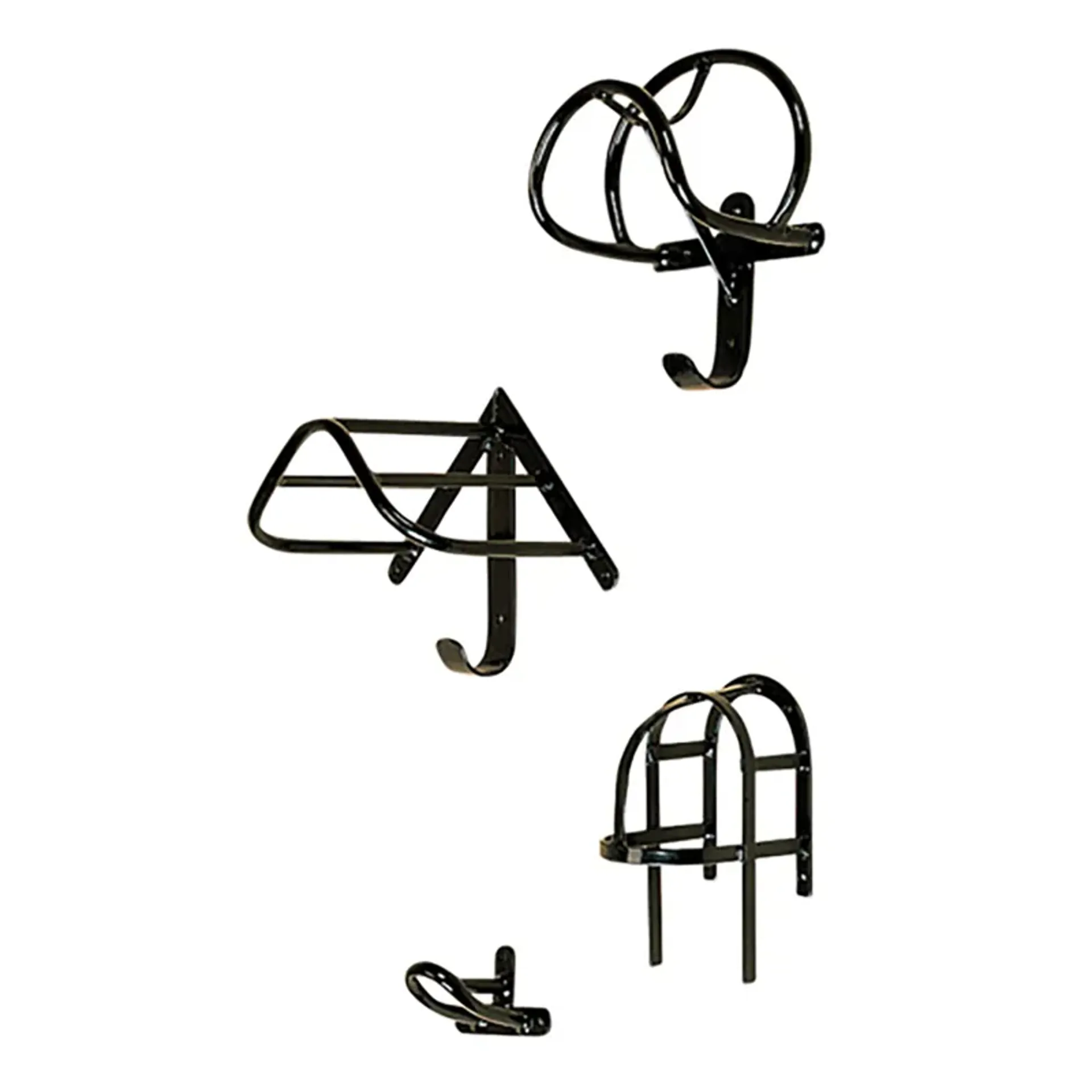 Consisting of collar, saddle, bridle and reins racks, this traditionally styled set is very robust. Black stubbyfine coated steel construction.