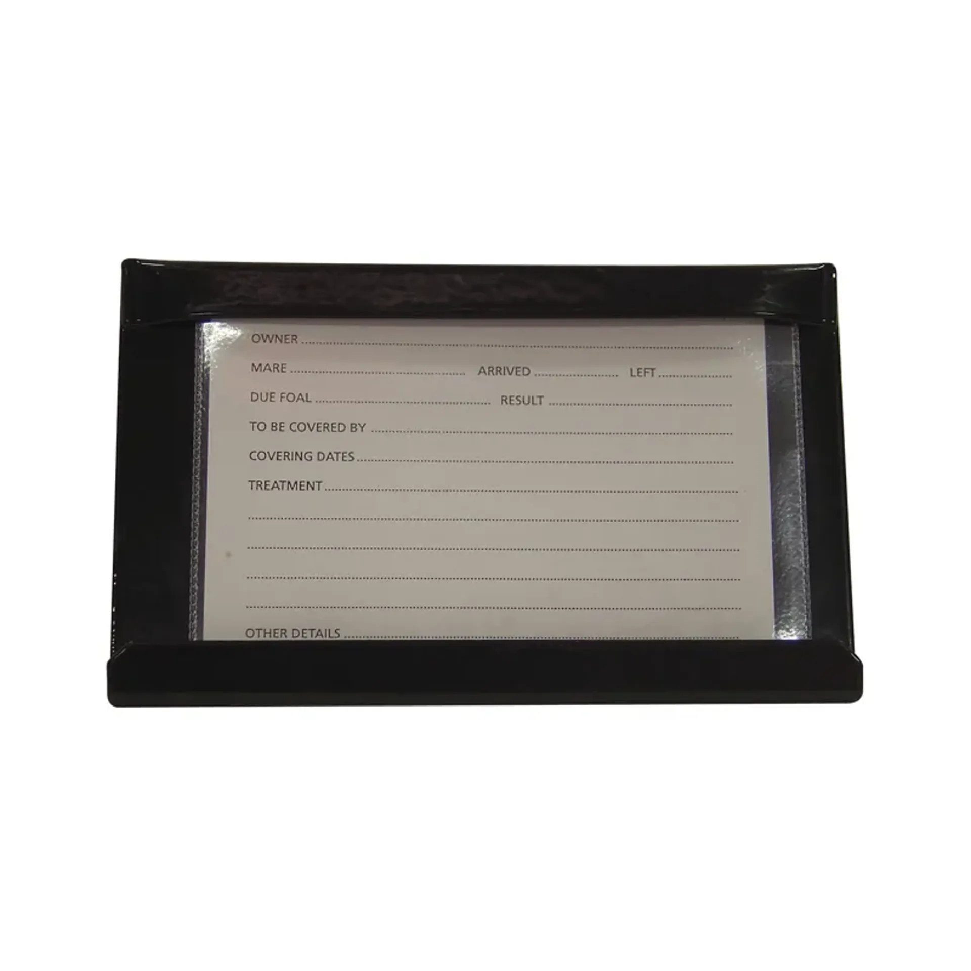 Handy to have cardholder, display horse details on a printed card protected by a plastic wallet. Holder is pre-galvanised steel and stubbyfine coated. 15cm x 10cm.