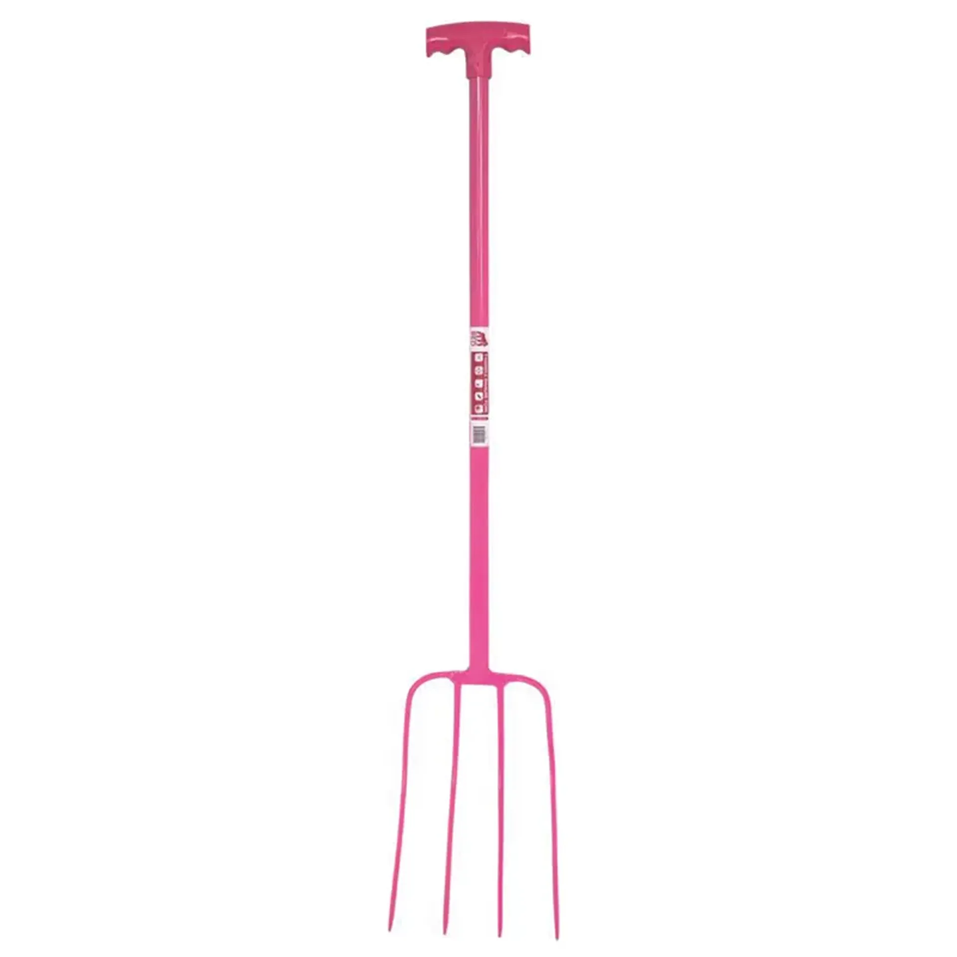 Strong yet lightweight manure fork with a tubular steel shaft and plastic T-handle.