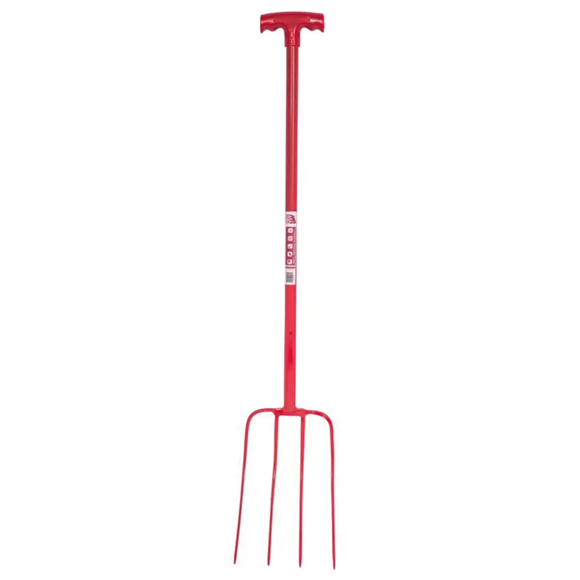 Strong yet lightweight manure fork with a tubular steel shaft and plastic T-handle.